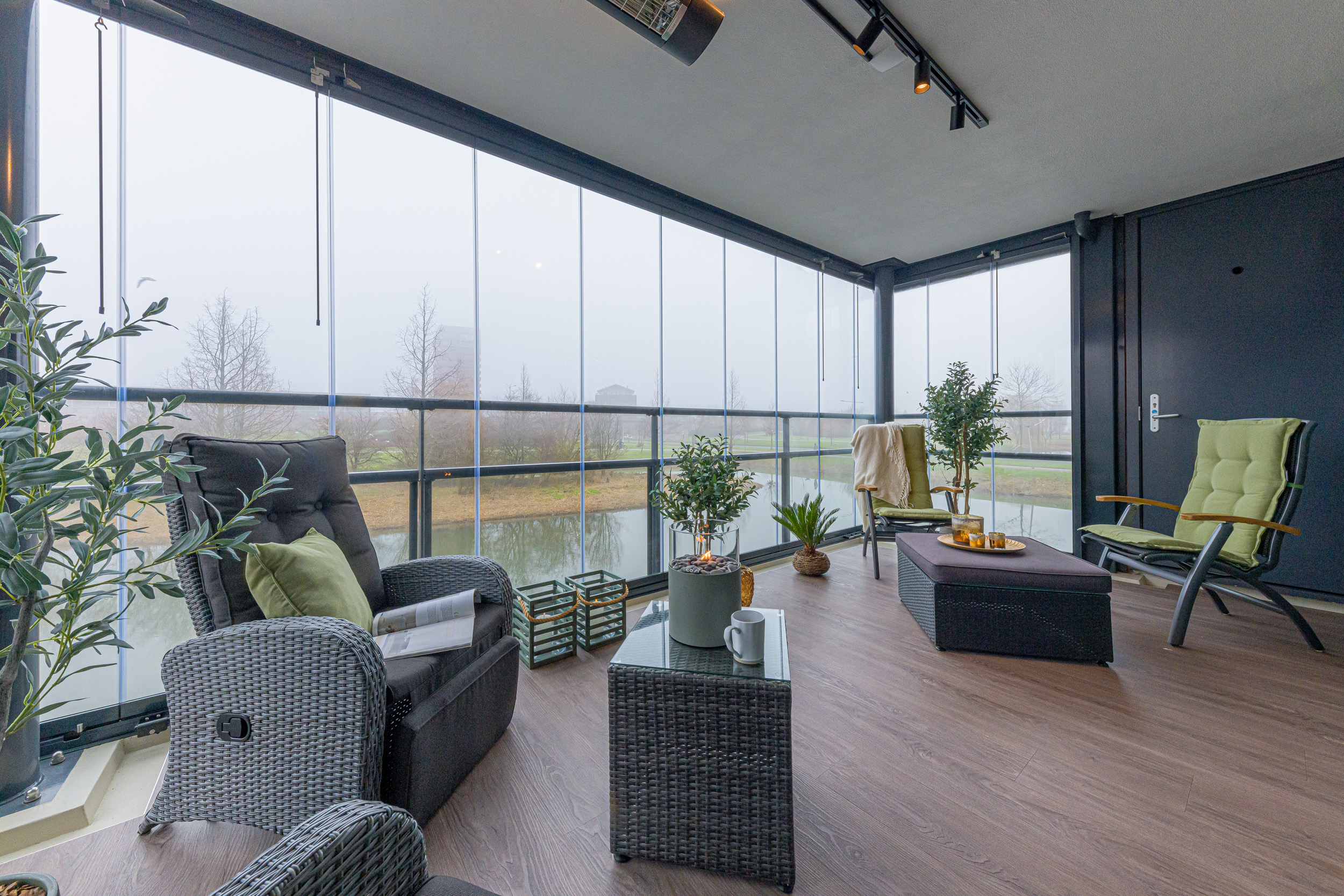 De slanke profielen en heldere glaspanelen zorgen ervoor dat het uitzicht behouden blijft. Daglicht blijft volop binnenstromen en het contact met buiten blijft zichtbaar aanwezig. Ook vanuit de woonkamer vormt het balkon één geheel met de leefruimte.