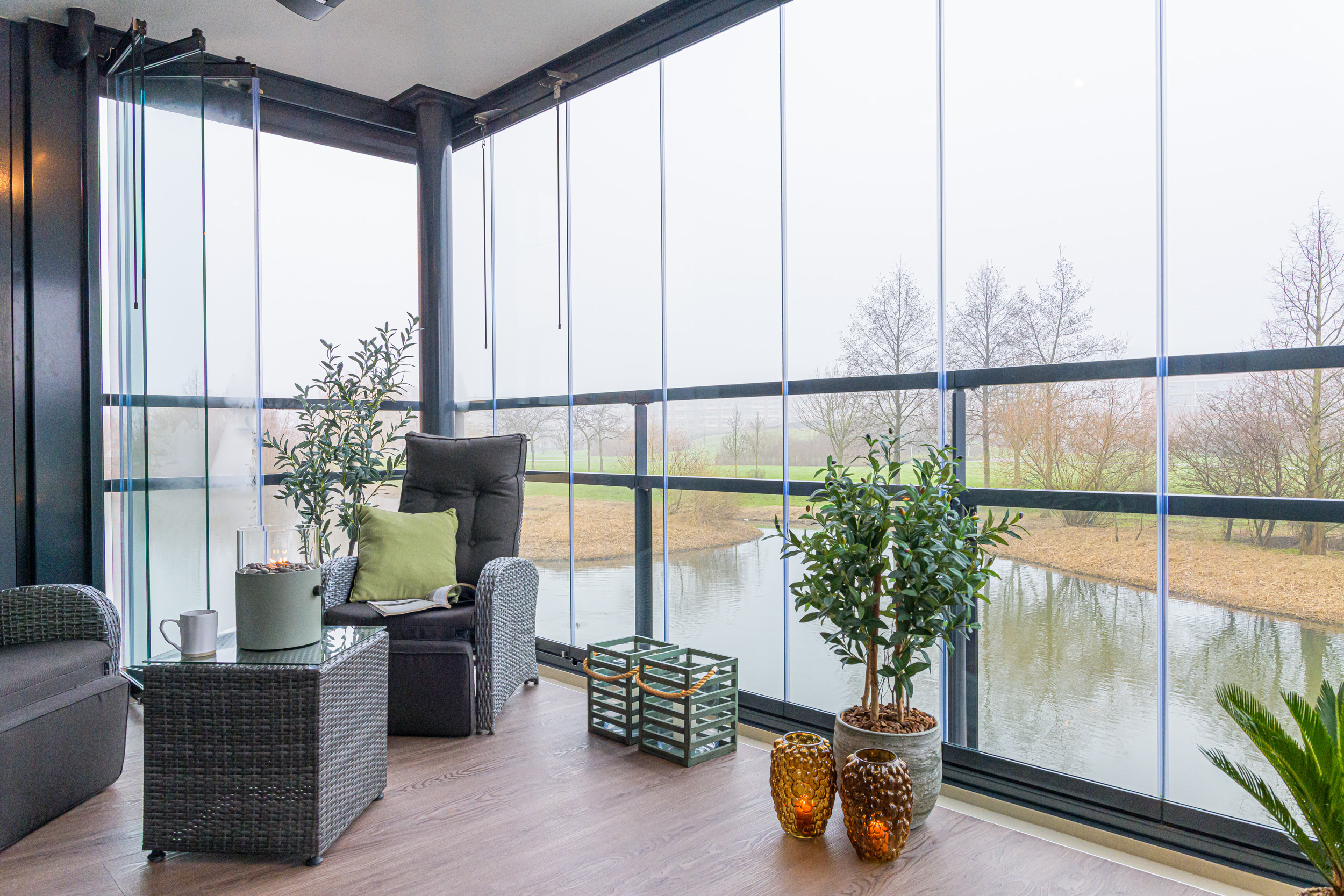 Met volledig te openen balkonbeglazing is dit balkon getransformeerd tot een comfortabele buitenruimte, beschut tegen wind en regen maar met behoud van uitzicht.