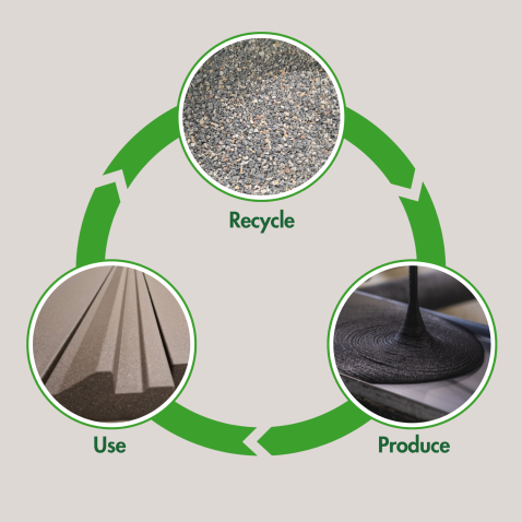 Dankzij ons innovatieve proces hergebruiken we afvalstukken van composietsteen en geven we deze nieuw leven in de vorm van duurzame bouwelementen.
