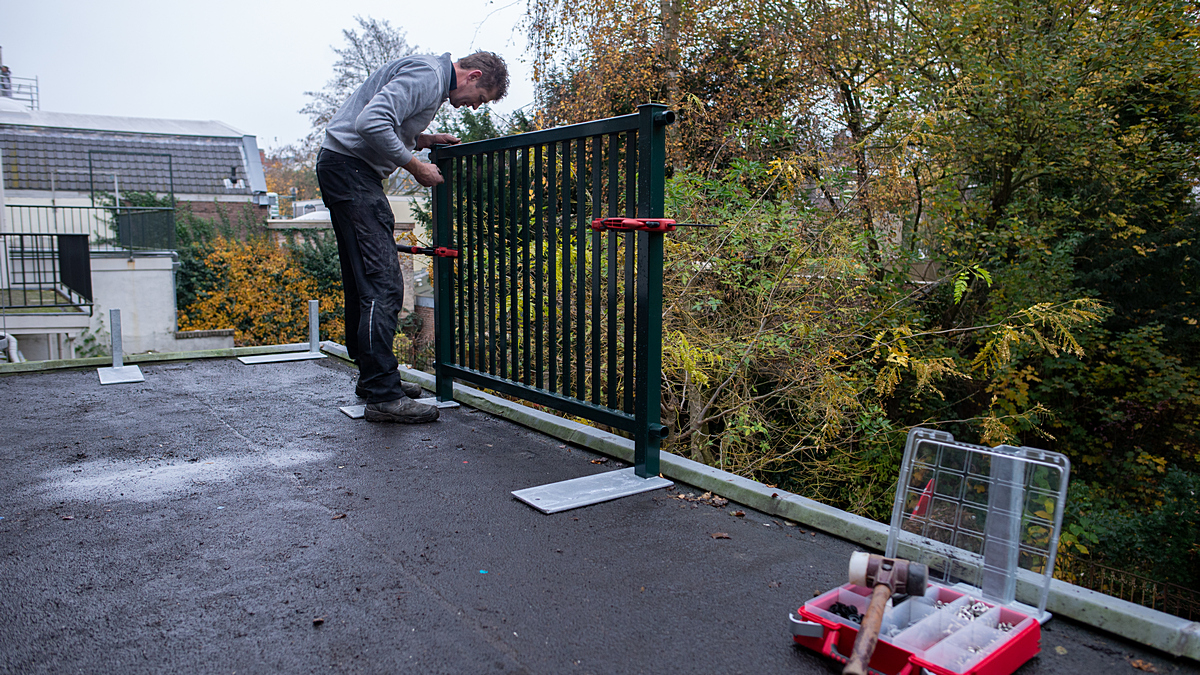 Het oude hekwerk en de houten vlonder op dit balkon in Utrecht hebben we vervangen. De nieuwe materialen zijn een fraai stalen hek en een vloer van keramische tegels met houtlook.