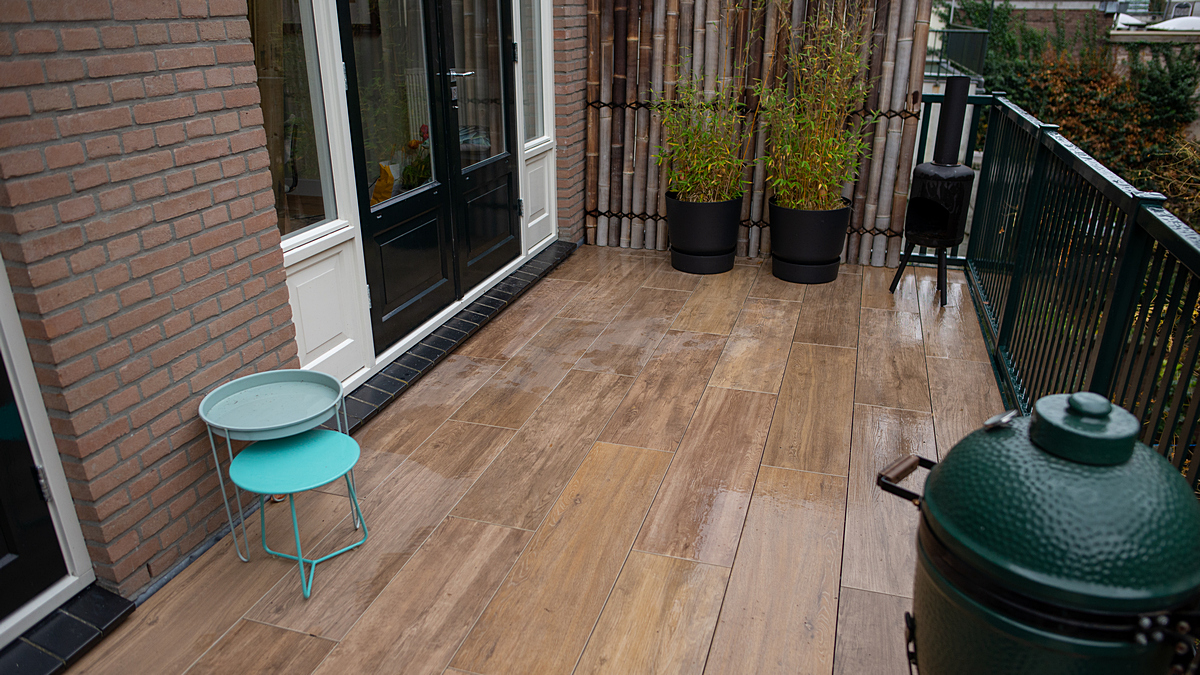 De vlonder op dit balkon was groen en glad. Deze was dus aan vervanging toe. Deze klant vond bij Exclusieve Dakterrassen een perfect alternatief: keramische tegels met een natuurlijke houtlook.