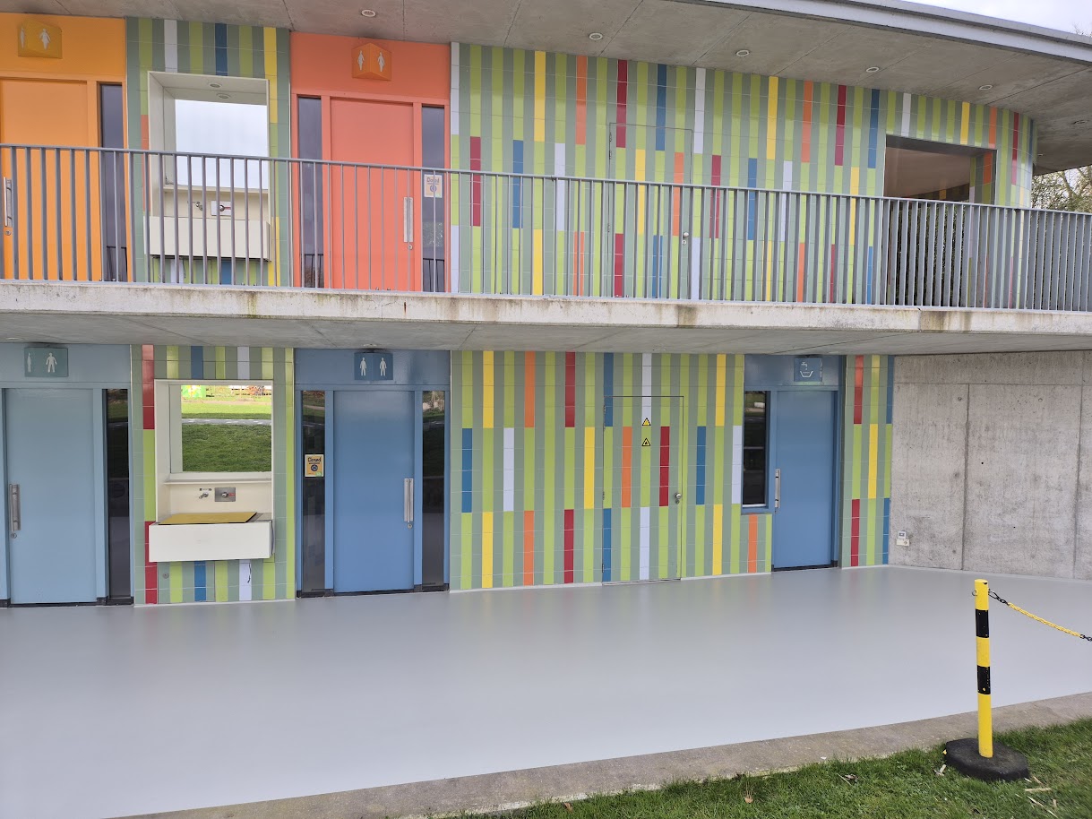 Dit toch al vrolijke sanitair gebouw is daarmee nu nóg fijner in gebruik. Dankzij de coating is het beter bestand tegen intensief gebruik, vocht en slijtage, en blijft het netjes en hygiënisch.