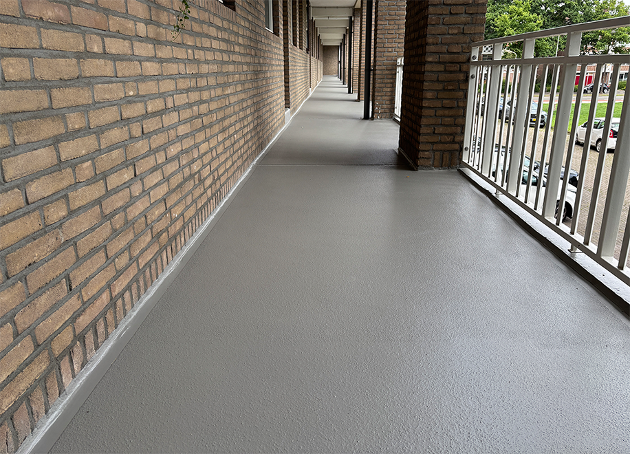De oplossingVoor dit project is gekozen voor het Triflex BFS-systeem. Dit robuuste slijtlaagsysteem is bij uitstek geschikt voor galerijen en balkons en biedt langdurige bescherming van de betonnen ondergrond. Bovendien egaliseert het systeem de aanwezige oneffenheden, waardoor een strak en representatief eindresultaat ontstaat. Dankzij de hoge slijtvastheid kan het oppervlak intensief worden gebruikt zonder dat dit ten koste gaat van de kwaliteit en levensduur.